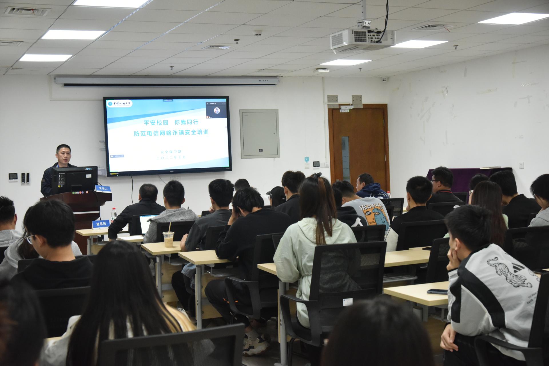 2022年秋季学期学生安全教育工作会议在环境楼347报告厅召开,学校未来城校区保卫办科长彭红进作校园安全教育讲座,重点强调防盗、防电信网络诈骗以及疫情防控等内容。讲座之后,学院党委副书记王海锋布置学生安全教育和检查专项工作。