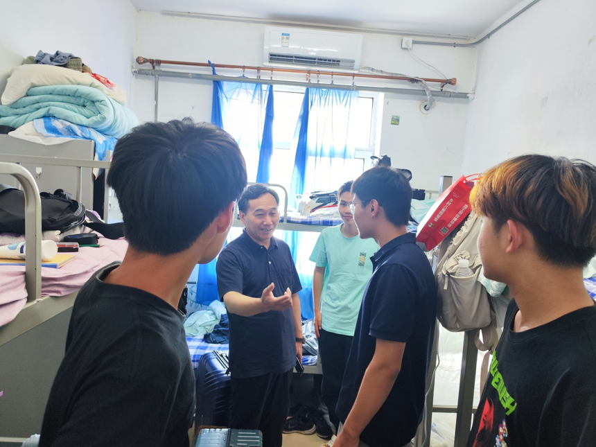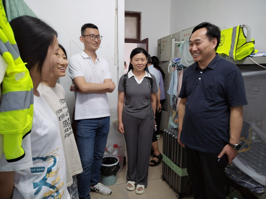 7日下午,李素矿一行刚到实习站,便前往学生宿舍看望实习学生。在学生宿舍,李素矿与同学们亲切交谈,关心了解同学们实习生活情况,交流实习体会感悟。他叮嘱同学们一定要注意安全,做好防暑降温,并勉励同学们发扬校训精神,不畏困难,认真学习,掌握扎实的专业实践本领。