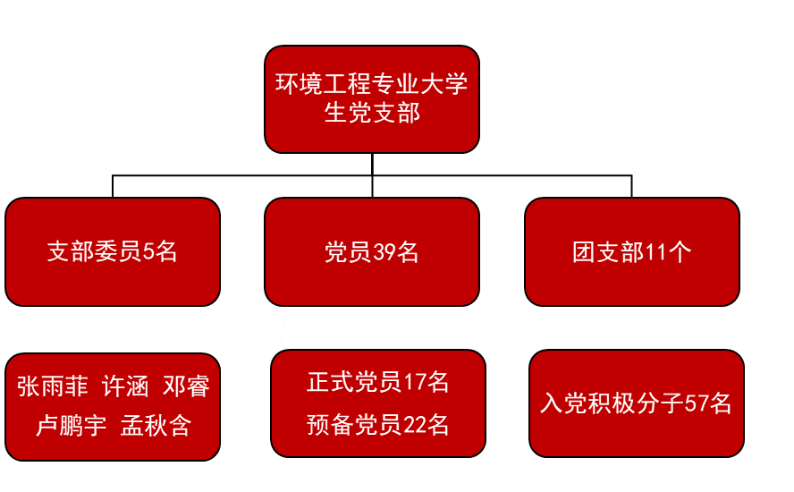 beat365中文官方网站环境工程专业大学生党支部共有党员39名,其中正式党员17名,预备党员22名,下属团支部现有入党积极分子57名。支部书记由张雨菲同志担任,其他支部委员分别为邓睿、许涵、卢鹏宇和孟秋含。