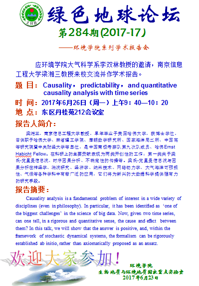 绿色地球论坛第284期(2017-17) ——beat365中文官方网站系列学术报告会 题目: Causality, predictability, and quantitative causality analysis with time series 时间:2017年6月26日(周一)上午9:40—10:20 地点:东区丹桂苑212会议室