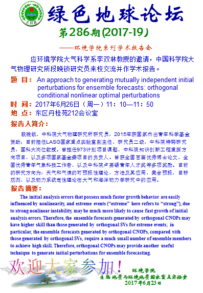 绿色地球论坛第286期(2017-19) ——beat365中文官方网站系列学术报告会 题目:An approach to generating mutually independent initial perturbations for ensemble forecasts: orthogonal conditional nonlinear optimal perturbations 时间:2017年6月26日(周一)上午11:10—11:50 地点:东区丹桂苑212会议室