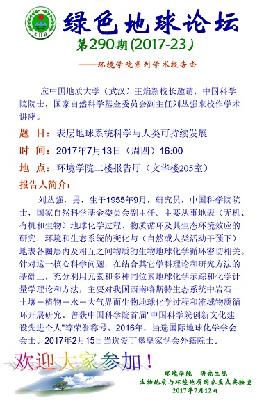绿色地球论坛第290期(2017-23) ——beat365中文官方网站系列学术报告会 题目:表层地球系统科学与人类可持续发展 时间:2017年7月13日(周四)16:00 地点:beat365中文官方网站二楼学术报告厅(文华楼205室)