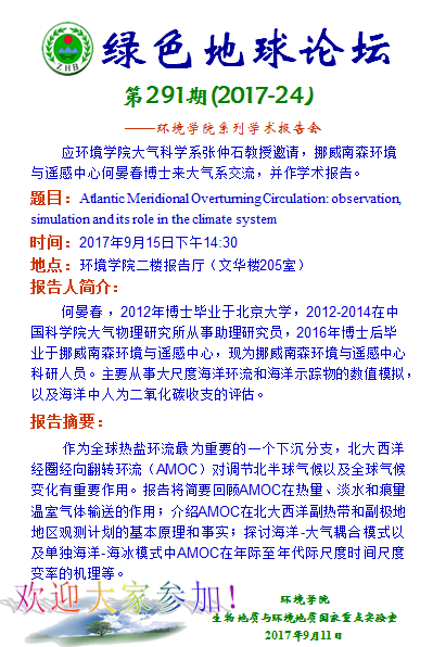 绿色地球论坛第291期(2017-24) ——beat365中文官方网站系列学术报告会 题目:Atlantic Meridional Overturning Circulation: observation, simulation and its role in the climate system (北大西洋经圈翻转环流的观测、模拟及其在气候系统中的作用) 时间:2017年9月15日下午14:30 地点:beat365中文官方网站二楼报告厅(文华楼205室)