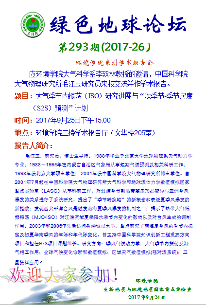 绿色地球论坛第293期(2017-26) ——beat365中文官方网站系列学术报告会 题目:大气季节内振荡(ISO)研究进展与“次季节-季节尺度(S2S)预测”计划 时间:2017年9月25日下午15:00 地点:beat365中文官方网站二楼学术报告厅(文华楼205室)