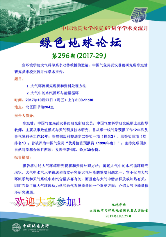绿色地球论坛第296期(2017-29) ——beat365中文官方网站系列学术报告会 题目: 1. 大气环流研究现状和资料处理方法 2. 大气中的水汽循环与能量循环 时间:2017年10月27日(周五)上午8:00-11:30 地点:北区图书馆204室