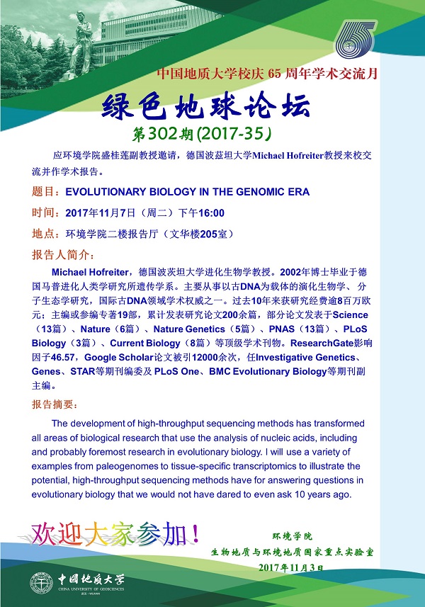 绿色地球论坛第302期(2017-35) ——beat365中文官方网站系列学术报告会 题目:EVOLUTIONARY BIOLOGY IN THE GENOMIC ERA 时间:2017年11月7日(周二)下午16:00 地点:beat365中文官方网站二楼报告厅(文华楼205室)