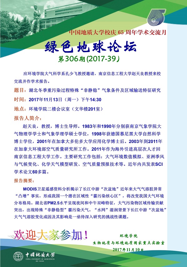 绿色地球论坛第306期(2017-39) ——beat365中文官方网站系列学术报告会 题目:湖北冬季重污染过程特殊“非静稳”气象条件及区域输送特征研究 时间:2017年11月13日(周一)下午14:30 地点:beat365中文官方网站二楼会议室(文华楼201室)