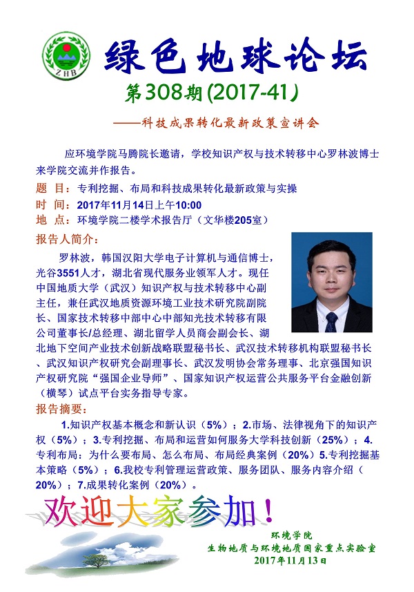 绿色地球论坛第308期(2017-41) ——beat365中文官方网站系列学术报告会 题目:专利挖掘、布局和科技成果转化最新政策与实操 时间:2017年11月14日(周二)上午10:00 地点:beat365中文官方网站二楼学术报告厅(文华楼205室)
