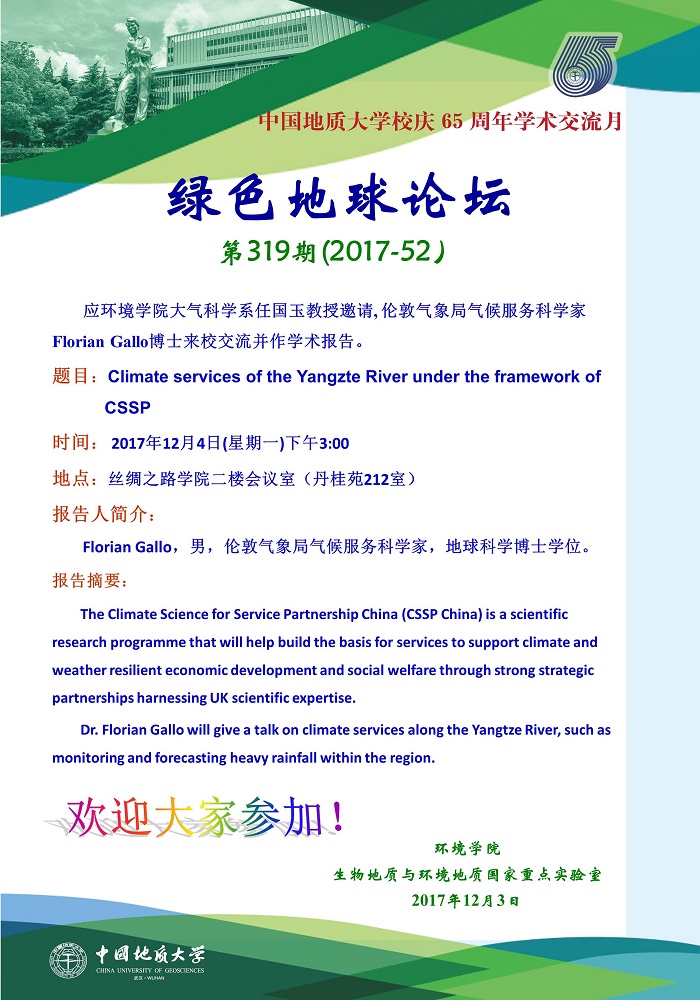 绿色地球论坛第319期(2017-52) beat365中文官方网站“校庆65周年学术交流月”——高知论坛 题目:Climate services of the Yangzte River under the framework of CSSP 时间:2017年12月4日(周一)下午15:00 地点:丹桂苑212室