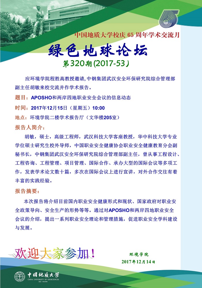 绿色地球论坛第320期(2017-53) beat365中文官方网站“校庆65周年学术交流月”——高知论坛 题目:APOSHO和两岸四地职业安全会议的信息动态 时间:2017年12月15日(周五)上午10:00 地点:beat365中文官方网站二楼学术报告厅(文华楼205室)
