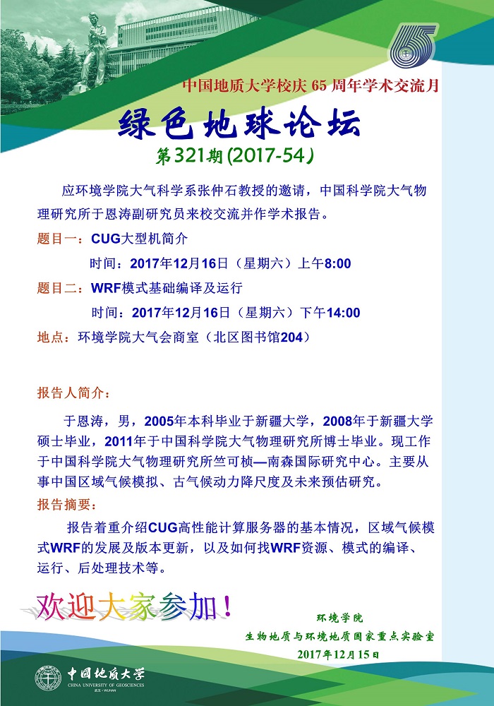 绿色地球论坛第321期(2017-54) beat365中文官方网站“校庆65周年学术交流月”——高知论坛 题目一:CUG大型机简介 时间:2017年12月16日(星期六)上午8:00 题目二:WRF模式基础编译及运行 时间:2017年12月16日(星期六)下午14:00 地点:beat365中文官方网站大气会商室(北区图书馆204)