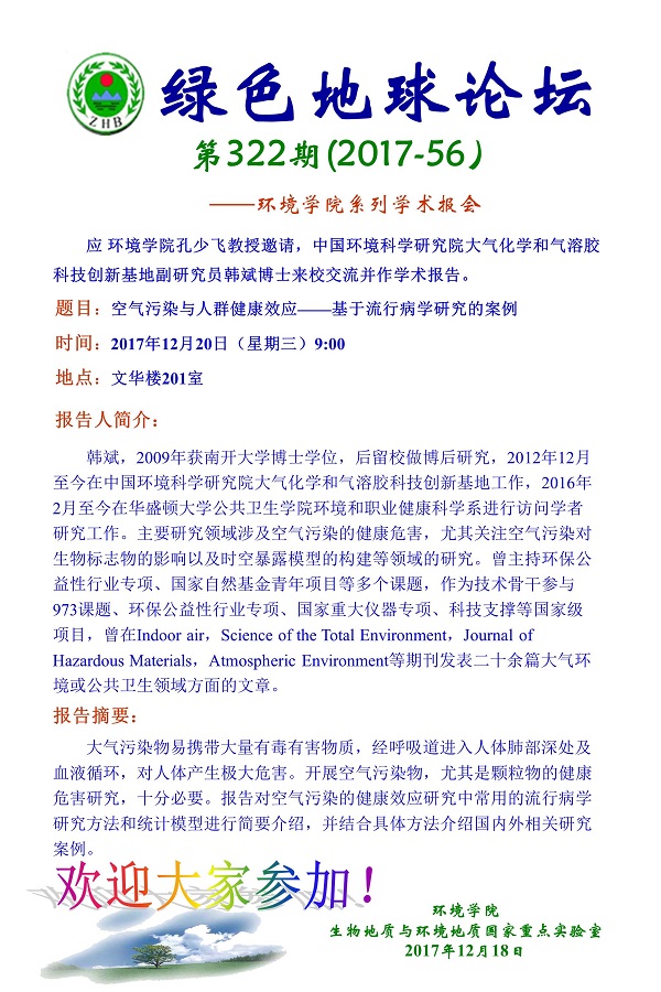 绿色地球论坛第322期(2017-56)——beat365中文官方网站系列学术报告会 题目:空气污染与人群健康效应——基于流行病学研究的案例 时间:2017年12月20日(星期三) 上午9:00 地点:文华楼201室