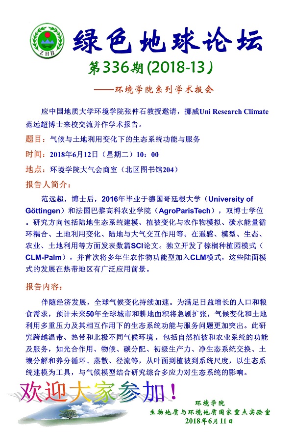 绿色地球论坛第336期(2018-13) ——beat365中文官方网站系列学术报告会 题目:气候与土地利用变化下的生态系统功能与服务 时间:2018年6月12日上午10:00 地点:beat365中文官方网站大气会商室(北区图书馆204)