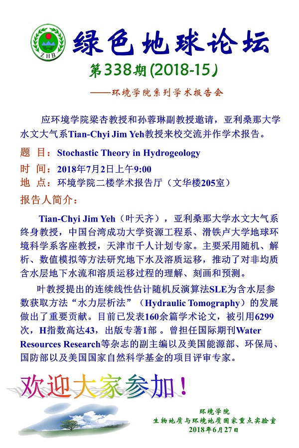 绿色地球论坛第338期(2018-15) ——beat365中文官方网站系列学术报告会 题目:Stochastic Theory in Hydrogeology 时间:2018年7月2日上午9:00 地点:beat365中文官方网站二楼学术报告厅(文华楼205室)