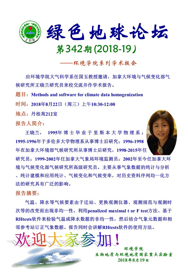 绿色地球论坛第342期(2018-19) ——beat365中文官方网站系列学术报告会 题目:Methods and software for climate data homogenization 时间:2018年8月22日(周三)上午10:30-12:00 地点:丹桂苑212室
