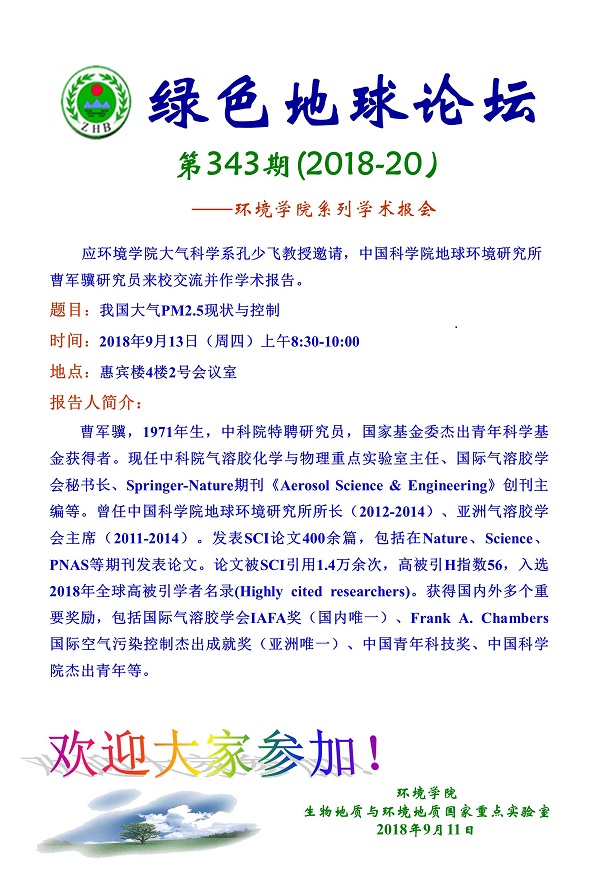 绿色地球论坛第343期(2018-20) ——beat365中文官方网站系列学术报告会 题目:我国大气PM2.5现状与控制 时间:2018年9月13日(周四)上午8:30-10:00 地点:惠宾楼4楼2号会议室
