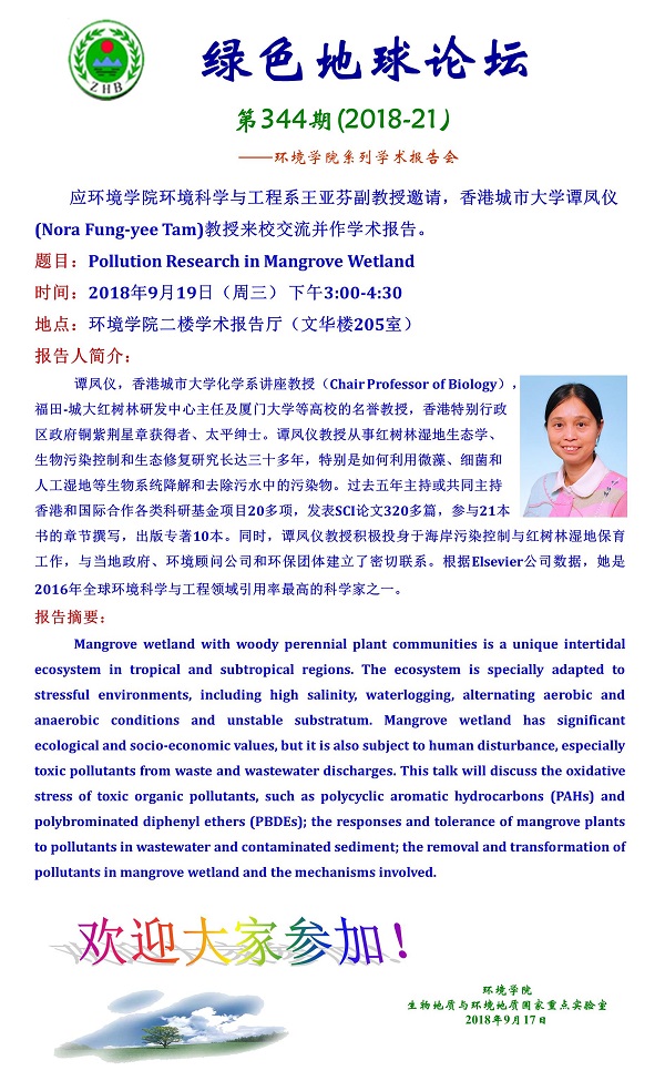 绿色地球论坛第344期(2018-21) ——beat365中文官方网站系列学术报告会 题目:Pollution Research in Mangrove Wetland 时间:2018年9月19日(周三)下午3:00-4:30 地点:beat365中文官方网站二楼学术报告厅(文华楼205室)