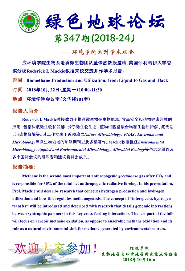 绿色地球论坛第347期(2018-24) ——beat365中文官方网站系列学术报告会 题目:Biomethane Production and Utilization: from Liquid to Gas and Back 时间:2018年10月22日(周一)上午10:00-11:30 地点:beat365中文官方网站会议室(文华楼201室)