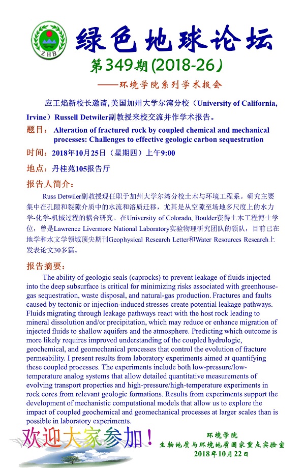 绿色地球论坛第349期(2018-26) ——beat365中文官方网站系列学术报告会 题目:Alteration of fractured rock by coupled chemical and mechanical processes: Challenges to effective geologic carbon sequestration 时间:2018年10月25日(周四)上午9:00 地点:丹桂苑105报告厅