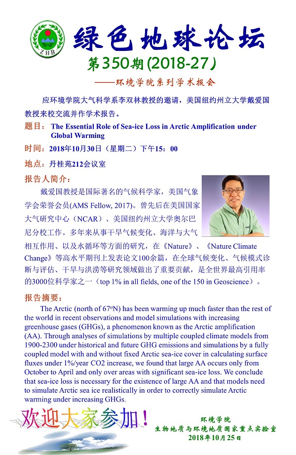 绿色地球论坛第350期(2018-27) ——beat365中文官方网站系列学术报告会 题目:The Essential Role of Sea-ice Loss in Arctic Amplification under Global Warming 时间:2018年10月30日(周二)下午15:00 地点:丹桂苑212室