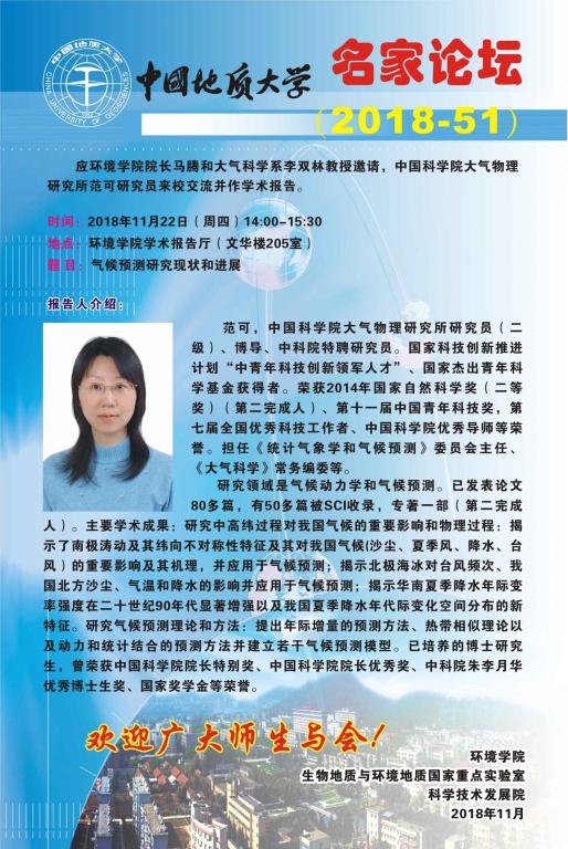名家论坛(2018-51) 题目:气候预测研究现状和进展 时间:2018年11月22日(周四)14:00 地点:beat365中文官方网站学术报告厅(文华楼205室)