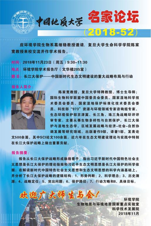 名家论坛(2018-52) 题目:长江大保护——中国新时代生态文明建设的重大战略布局与行动 时间:2018年11月23日(周五)9:30—11:30 地点:beat365中文官方网站学术报告厅(文华楼205室)