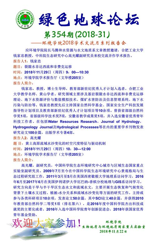 绿色地球论坛第354期(2018-31) ——beat365中文官方网站2018学术交流月系列报告会 题目: 裂隙水非达西流和非费克运移——钱家忠 黄土高原流域水沙变化的时空尺度特征与驱动机制——高光耀 时间:2018年11月29日(周四)9:00—12:00 地点:beat365中文官方网站学术报告厅(文华楼205室)