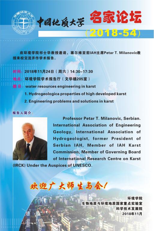 名家论坛(2018-54) 题目:water resources engineering in karst—— 1. Hydrogeologica properties of high developed karst 2. Engineering problems and solutions in karst 时间:2018年11月24日(周六)14:30 地点:beat365中文官方网站学术报告厅(文华楼205室)