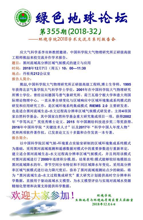绿色地球论坛第355期(2018-32) ——beat365中文官方网站2018学术交流月系列报告会 题目:黑河流域高分辨区域气候模式的建立与应用 时间:2018年12月7日(周五)10:00—11:30 地点:丹桂苑212会议室