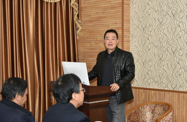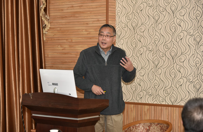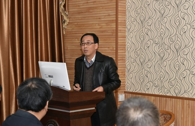靳孟贵教授作《微咸水膜下滴灌棉田水盐及微量元素协同调控》的学术报告。