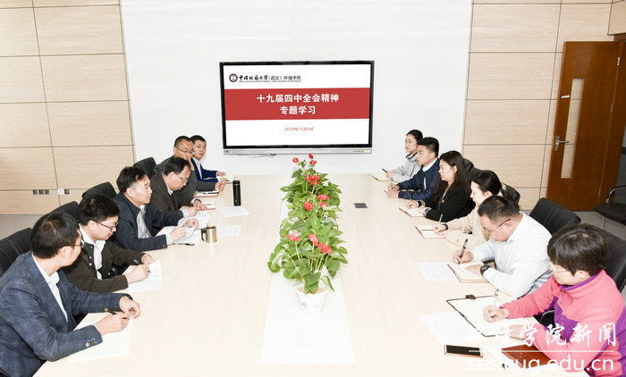 李素矿指出,十九届四中全会通过的《中共中央关于坚持和完善中国特色社会主义制度、推进国家治理体系和治理能力现代化若干重大问题的决定》,深刻回答了“坚持和巩固什么、完善和发展什么”这个重要政治命题,进一步明确了坚持和完善中国特色社会主义制度、推进国家治理体系和治理能力现代化这一重大战略任务。这一纲领性文件,标志着新中国进入了国家富强、民族振兴、人民幸福的“中国之治”新时代,开启了中华民族伟大复兴的新征程新境界。强调中国特色社会主义制度是党和人民在长期实践探索中形成的科学制度体系,我国国家治理一切工作和活动都依照中国特色社会主义制度展开,我国国家治理体系和治理能力是中国特色社会主义制度及其执行能力的集中体现。他要求,学院要按照学校党委统一部署要求,切实把学习宣传落实十九届四中全会精神作为当前和今后一个时期的重要政治任务,纳入学院正在开展的“不忘初心、牢记使命”主题教育全过程之中,学习好宣传好落实好,学院党委理论学习中心组、各师生党支部、党员干部师生要带头学习,领会精神实质内涵,武装头脑、内化于心,指导实践、外化于形,推动工作、取得实效;坚持以习近平新时代中国特色社会主义思想为统领,把十九届四中全会的新理念新论断新要求,融入学院人才培养、科学研究、社会服务、文化传承创新、国际交流合作各项工作,融入学院“三全育人”综合改革试点,融入学院“双一流”建设和综合改革,形成全员、全过程、全方位综合治理的办学治院新格局;要坚持党建领院、以史铭院、学术立院、人才强院、特色建院、文化兴院、开放活院、依法治院的科学治院理念,进一步优化强化政策、事实、程序一体推进的师生管理服务制度体系,提升治理能力,创新方式方法,努力推进学院高质量发展、内涵式发展,打造新时代跨学科教育、跨学科研究、跨学科治理的新体系,形成新时代水土气生环境学科群一体化育人的新模式,凝聚时代新合力、释放师生新活力、激活学院新动力,为依法治校和“中国之治”贡献新时代环境人的智慧和力量。