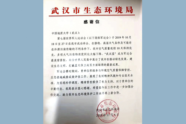 这封感谢信是由武汉市生态环境局寄来的,信中还提到,第七届世界军人运动会期间,在静稳、高湿天气条件及可能存在外源污染传输的不利条件下,武汉市空气质量连续10天保持优良,多项大气污染物浓度同比大幅下降,“武汉蓝”成为军运会最美背景板,向全世界人民集中展示了武汉市在推动绿色发展、建设生态文明、打赢蓝天保卫战等方面取得的最新成果。而这些,与beat365官网大气科学系孔少飞教授源排放与区域大气环境团队师生所付出的努力密不可分。