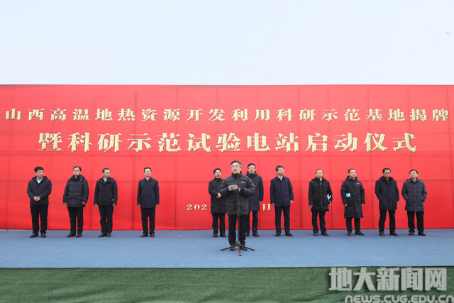 (严丽莎转自地大新闻网)(通讯员李素矿)1月25日,山西省高温地热资源科研基地暨试验电站启动仪式在大同市天镇县隆重举行。山西省委常委、大同市委书记张吉福、山西省副省长贺天才出席,山西省发改委、科技厅、自然资源厅、能源局、地勘局,煤炭地质局,大同市、天镇县等有关单位负责同志参加。我校校长王焰新院士出席并致辞。