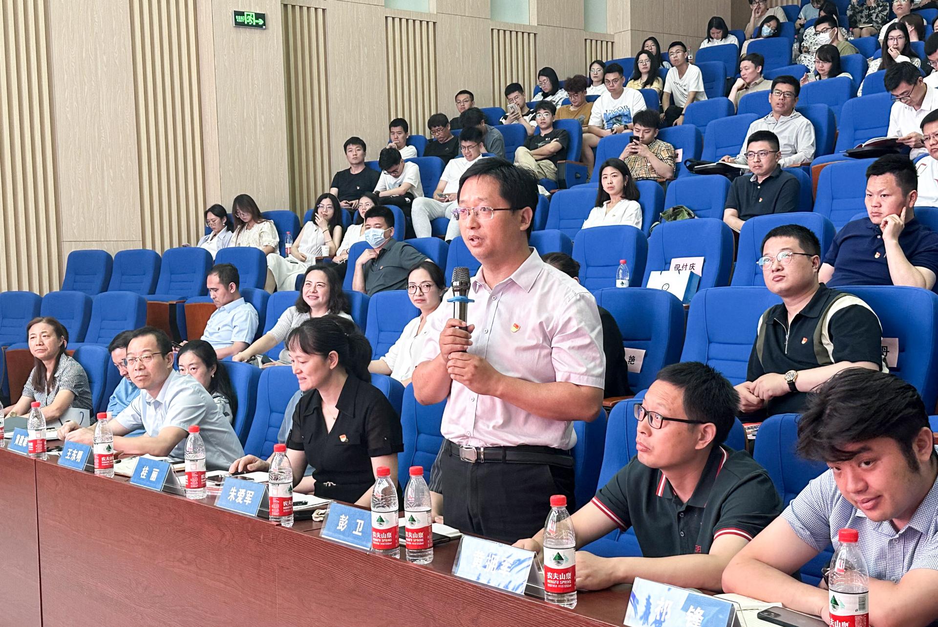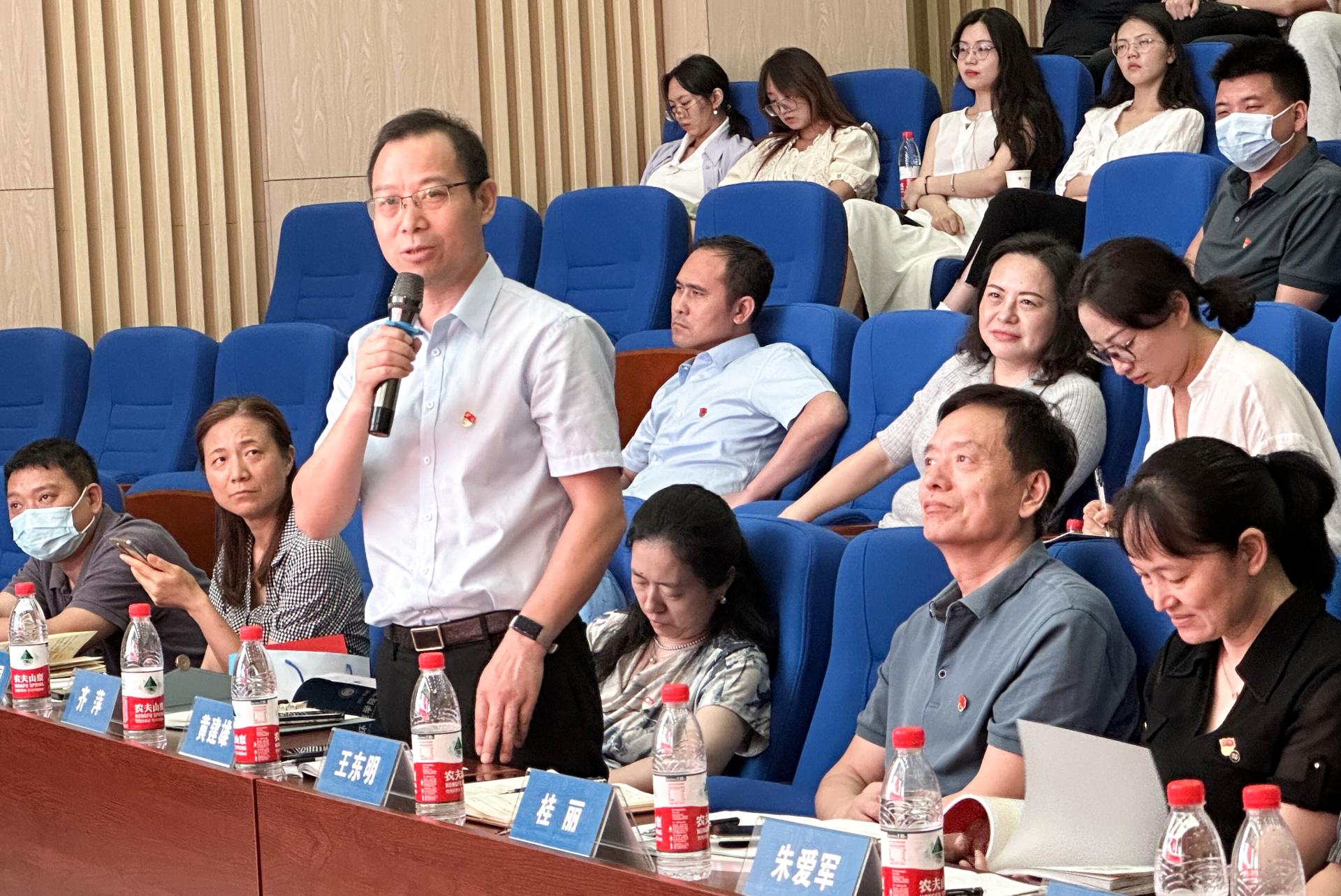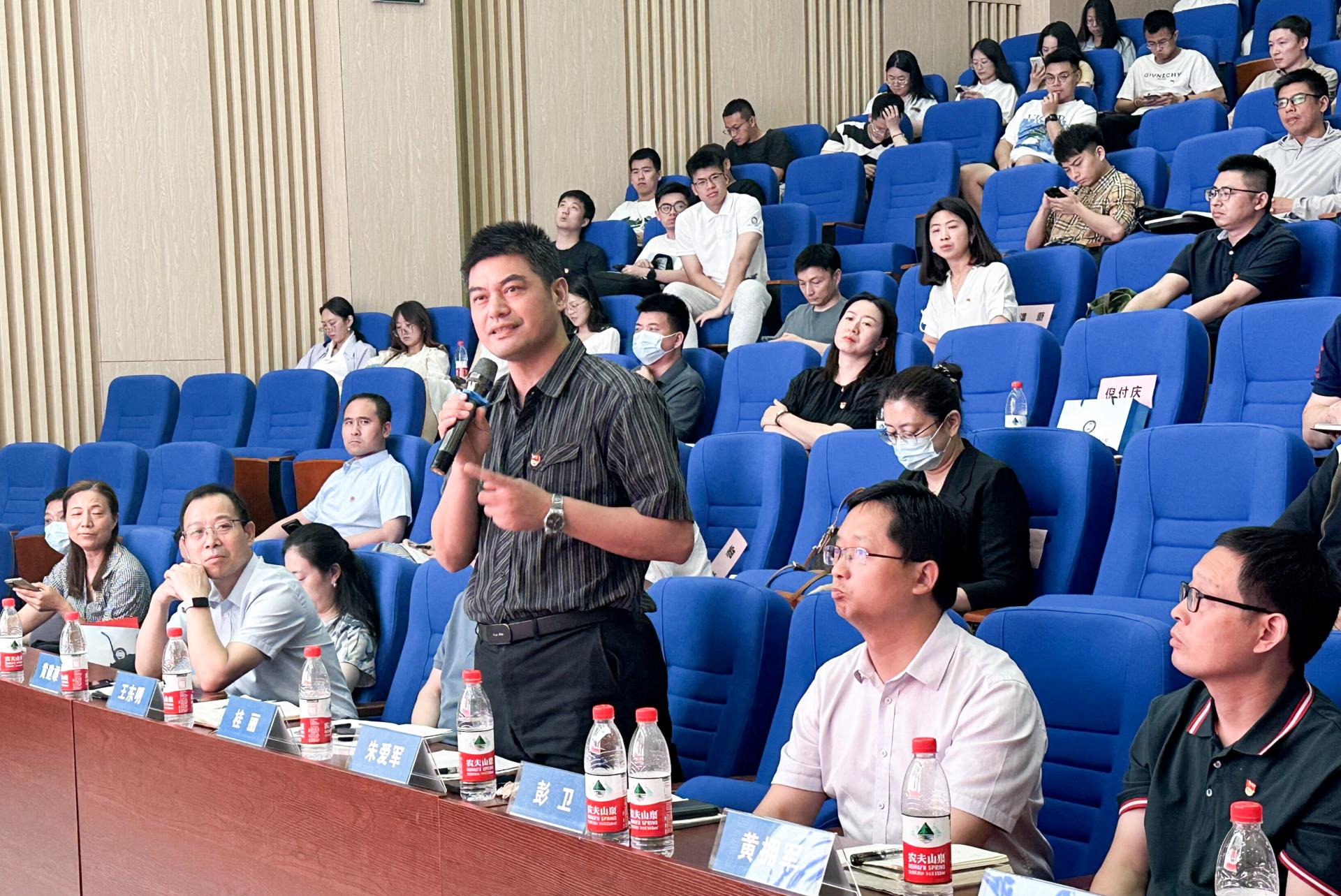 在交流环节,与会人员围绕党建与业务深度融合、学院治理体系与治理能力现代化、“张国旗班”建设、课程思政建设等方面进行提问交流,李素矿一一对答。