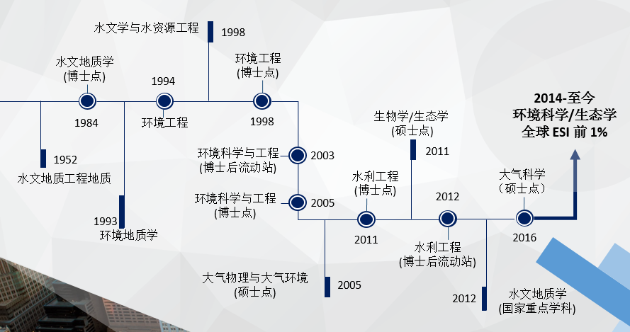 学院发挥多学科交叉优势,初步形成涵盖水、地、气、生的"大环境"学科生态系统框架,包括:环境科学与工程(2003)、水利工程(2012)博士后流动站;环境科学与工程(2005)、水利工程(2011)一级学科博士点和省重点学科;水文地质学(2012,国家重点)、环境微生物与生态技术(2012,自设)二级学科博士点;生物学(2011)、大气科学(2016)一级学科硕士点。拥有生物地质与环境地质国家重点实验室(共享)、盆地水文过程与湿地生态恢复校级学术创新基地(C类)、地下水与环境湖北省国际合作示范基地等平台。